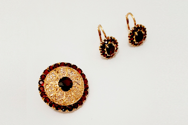 Spilla e orecchini originali degli anni '60 in Oro750/oo con pietre granato,...